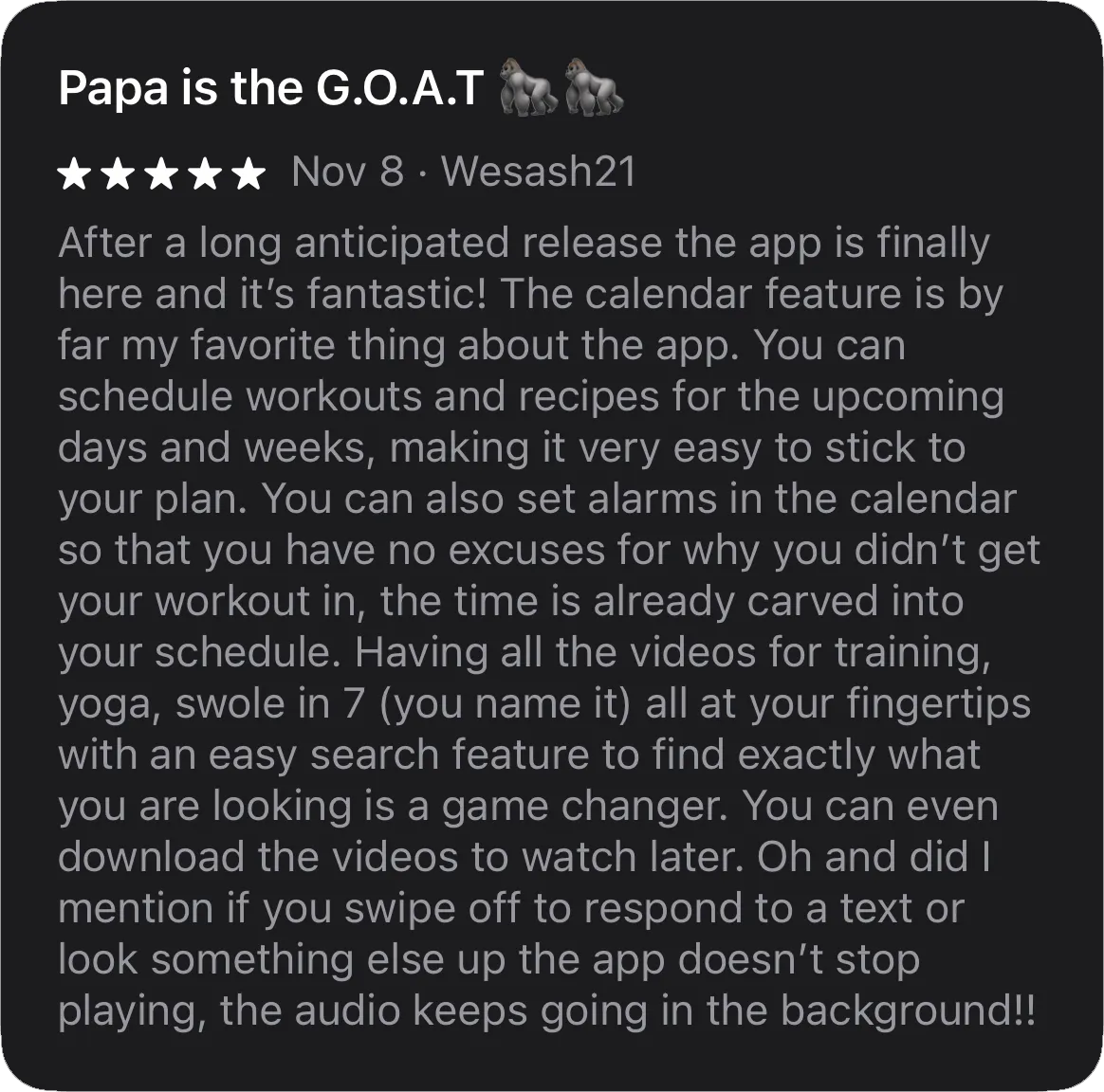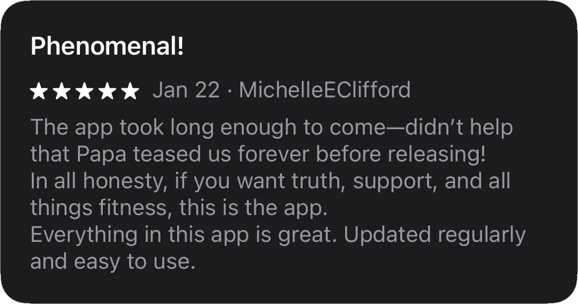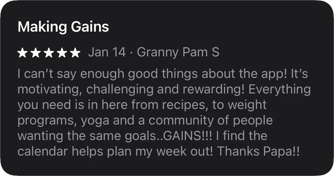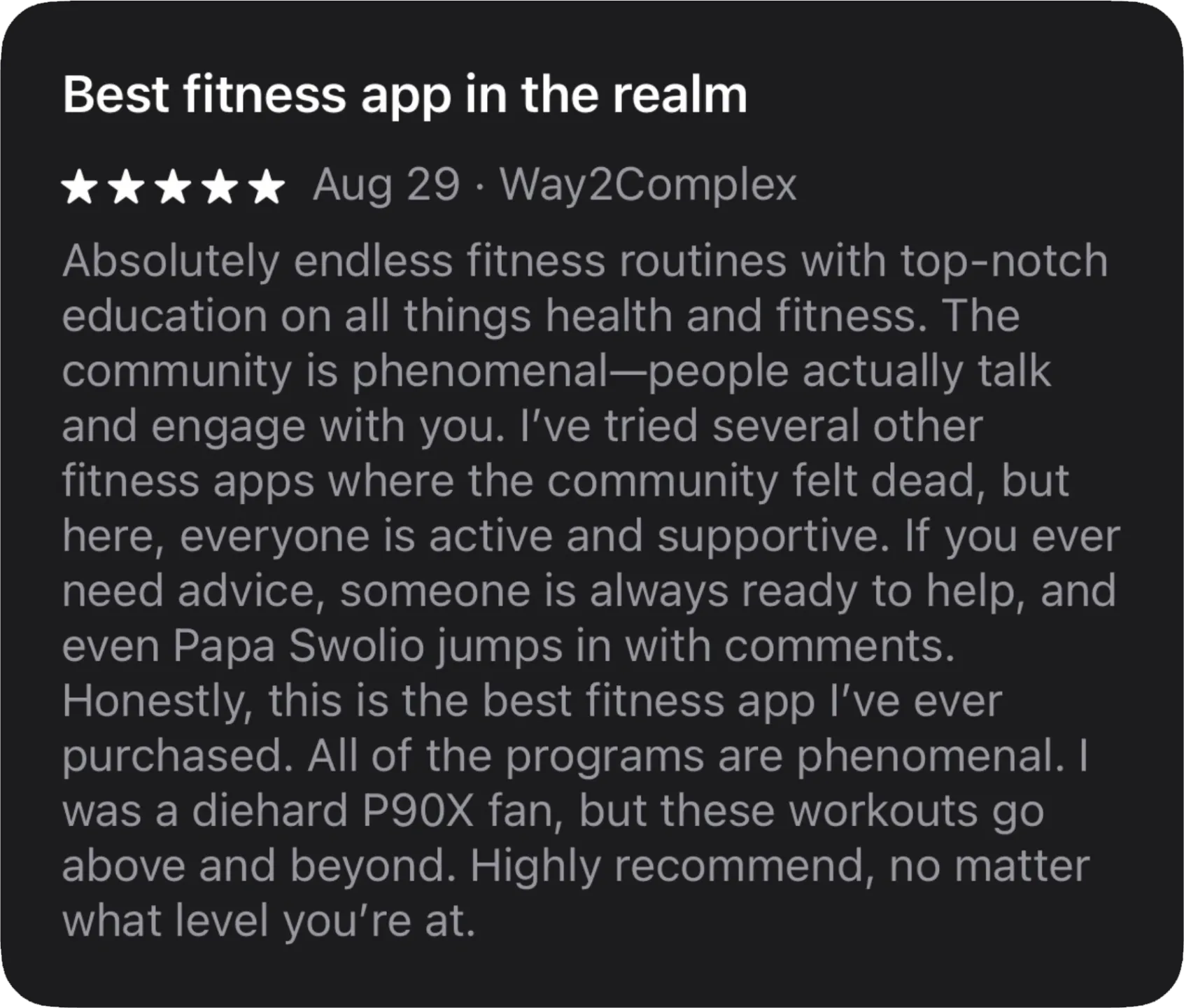 "The SwoleFam is consistency and support - doing something every single day that inches me closer to my goals has changed my entire life. Literally. Every aspect of my life has been improved."